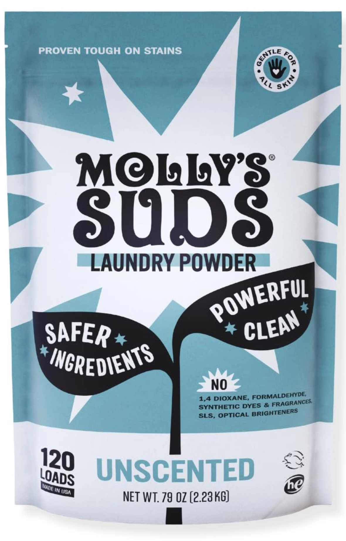 Molly’s Suds laundry powder is made with simple, effective ingredients to fight stains while staying safe for sensitive skin. Unscented for a gentle, clean wash every time.