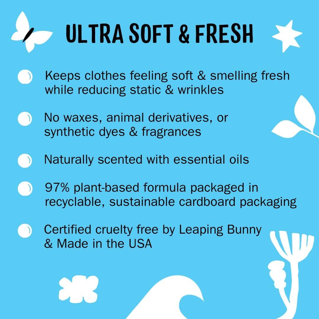 SOFT-STATIC FREE CLOTHES: Our 97% plant-based dryer sheets employ a gentle fabric softening technology to leave clothes feeling fresh, cozy, and comfy. Better for people with sensitive skin, the environment, and your dryer, these dryer sheets effectively eliminate static so you and your clothes look and feel your best